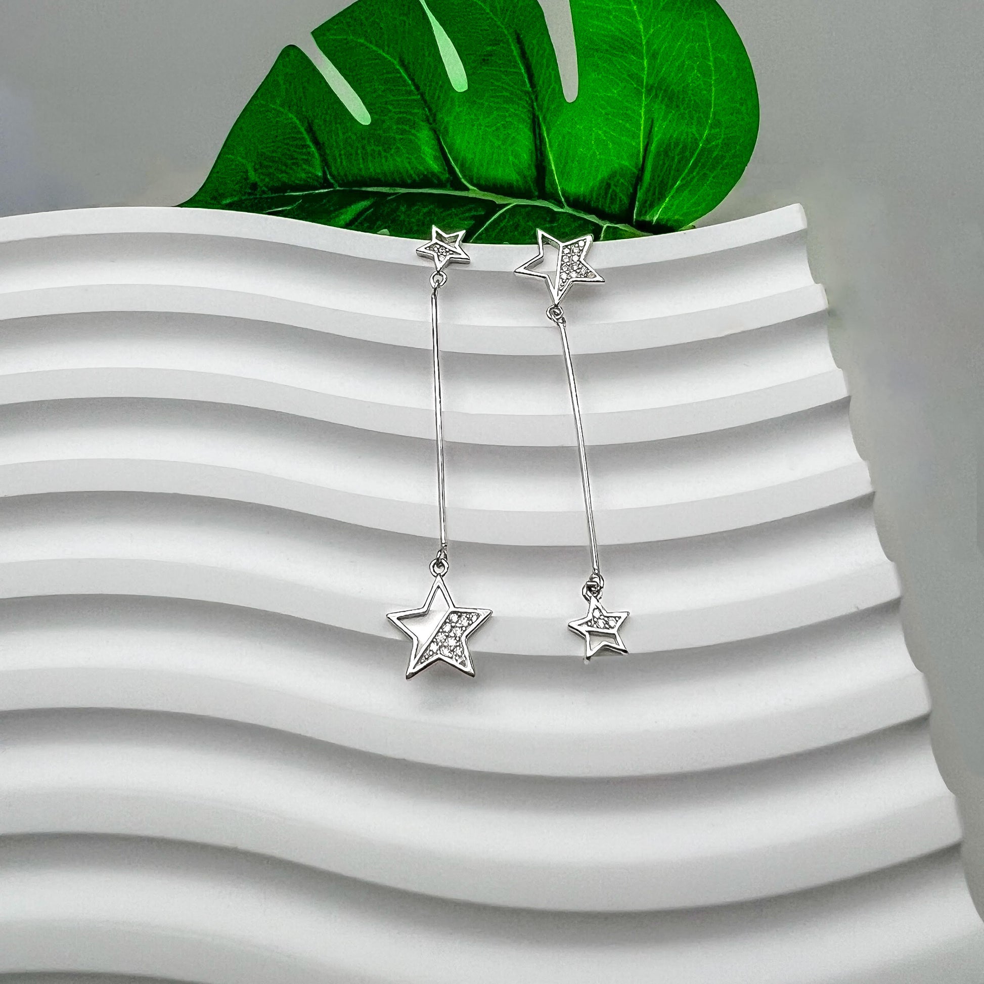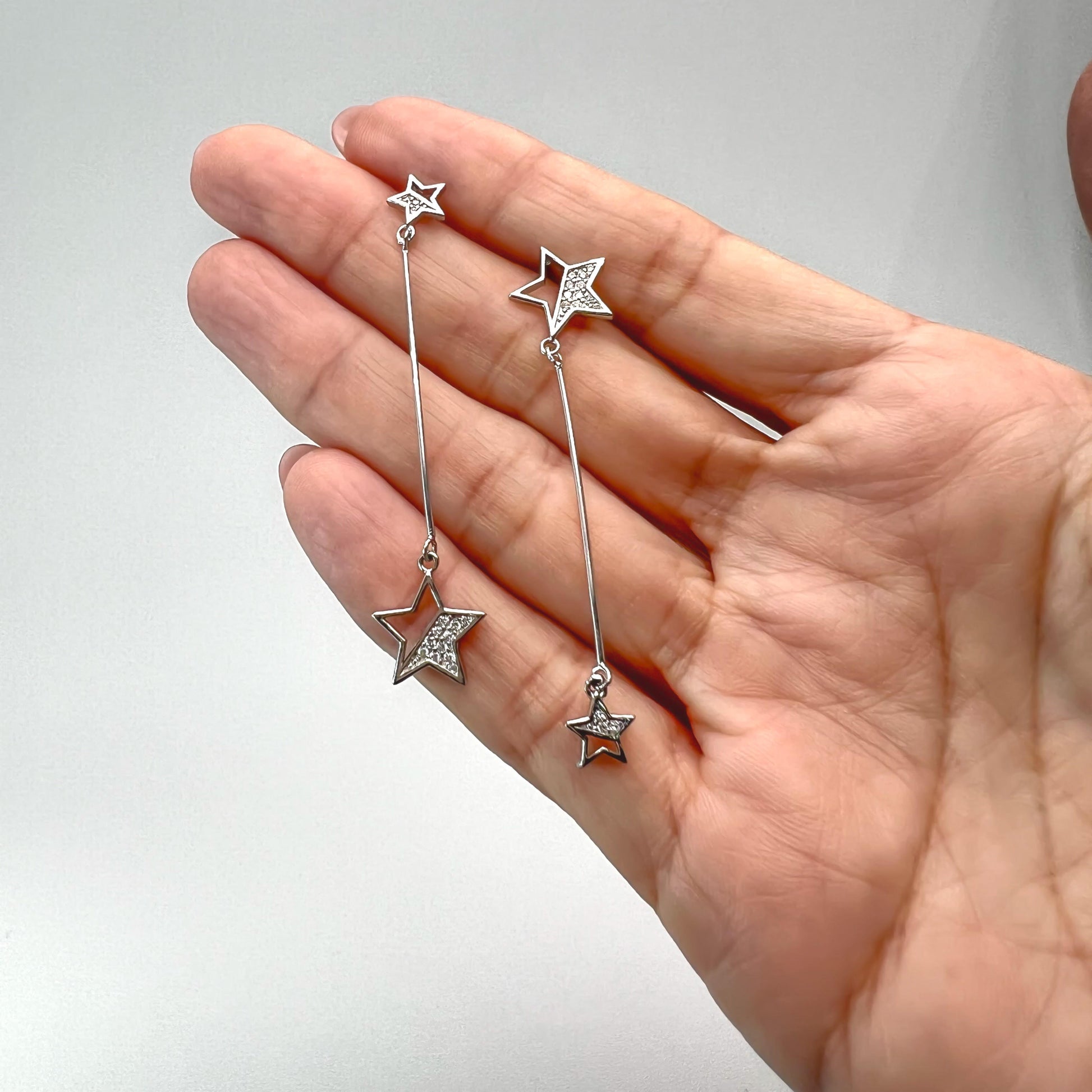 Aretes de plata estrellita colgante con medidas de 5.5cm x 1.1cm, elaborado en plata. Una pieza que combina elegancia y modernidad para cualquier ocasión.