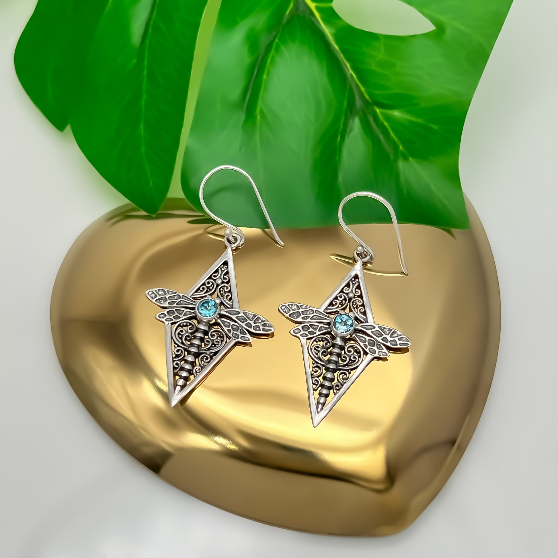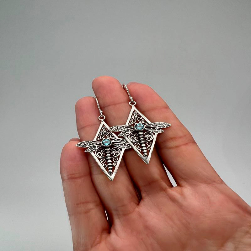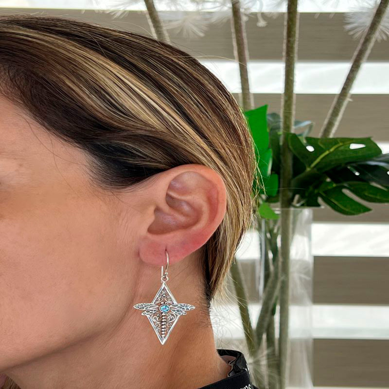 Aretes de Plata libélulas con Zirconia con medidas de 5.2cm x 2.5cm, elaborado en plata con tecnica de calado artesanal tipo Bali. Ideal para complementar atuendos casuales o formales.