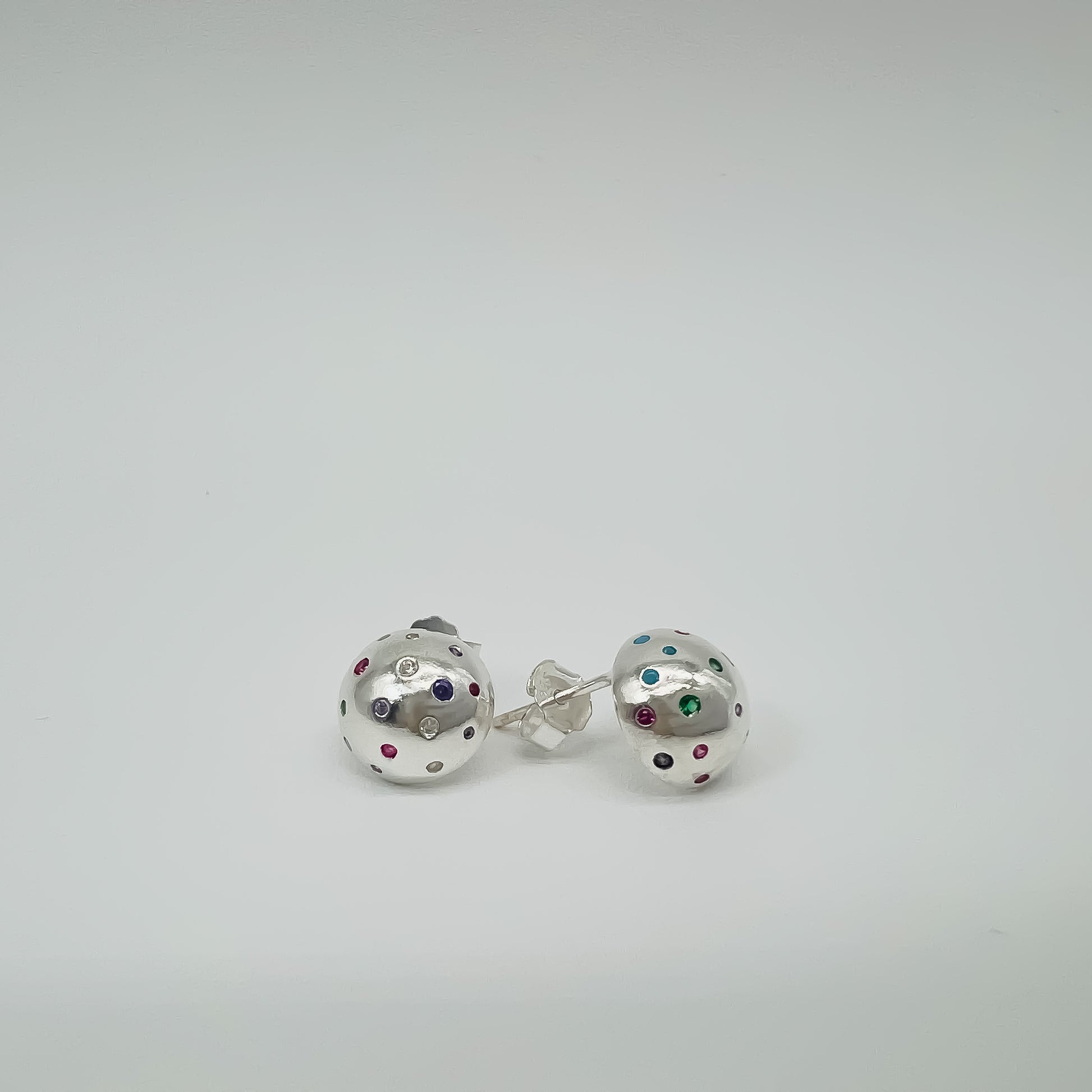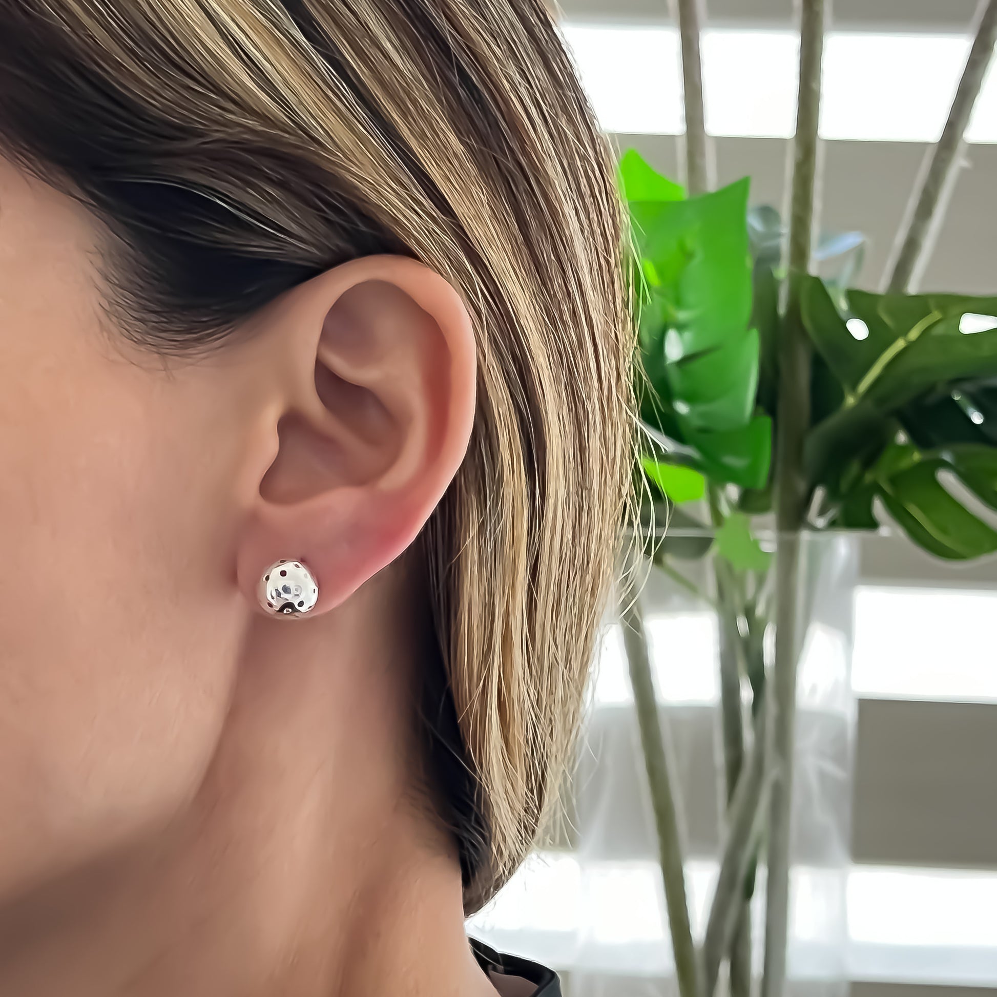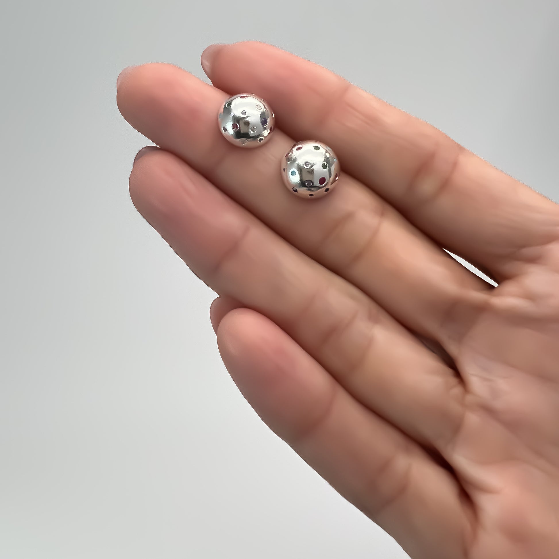 Aretes media bolita de plata con micro Zirconias con medidas de 10mm x 10mm, elaborado en plata. Un accesorio que destaca por su diseño único y detallado.