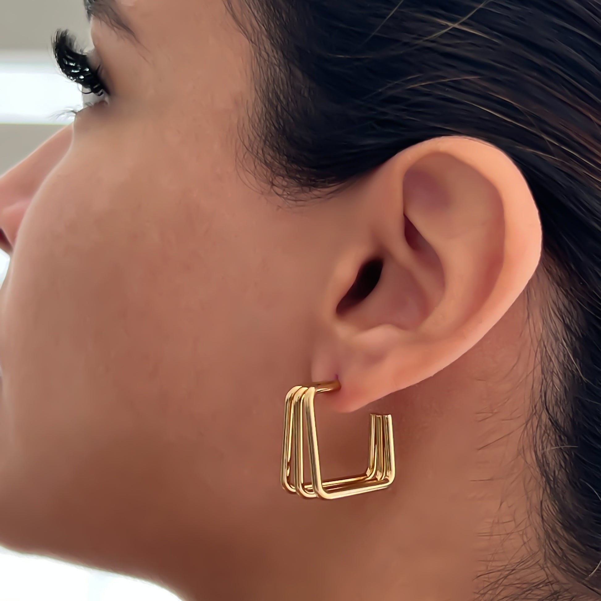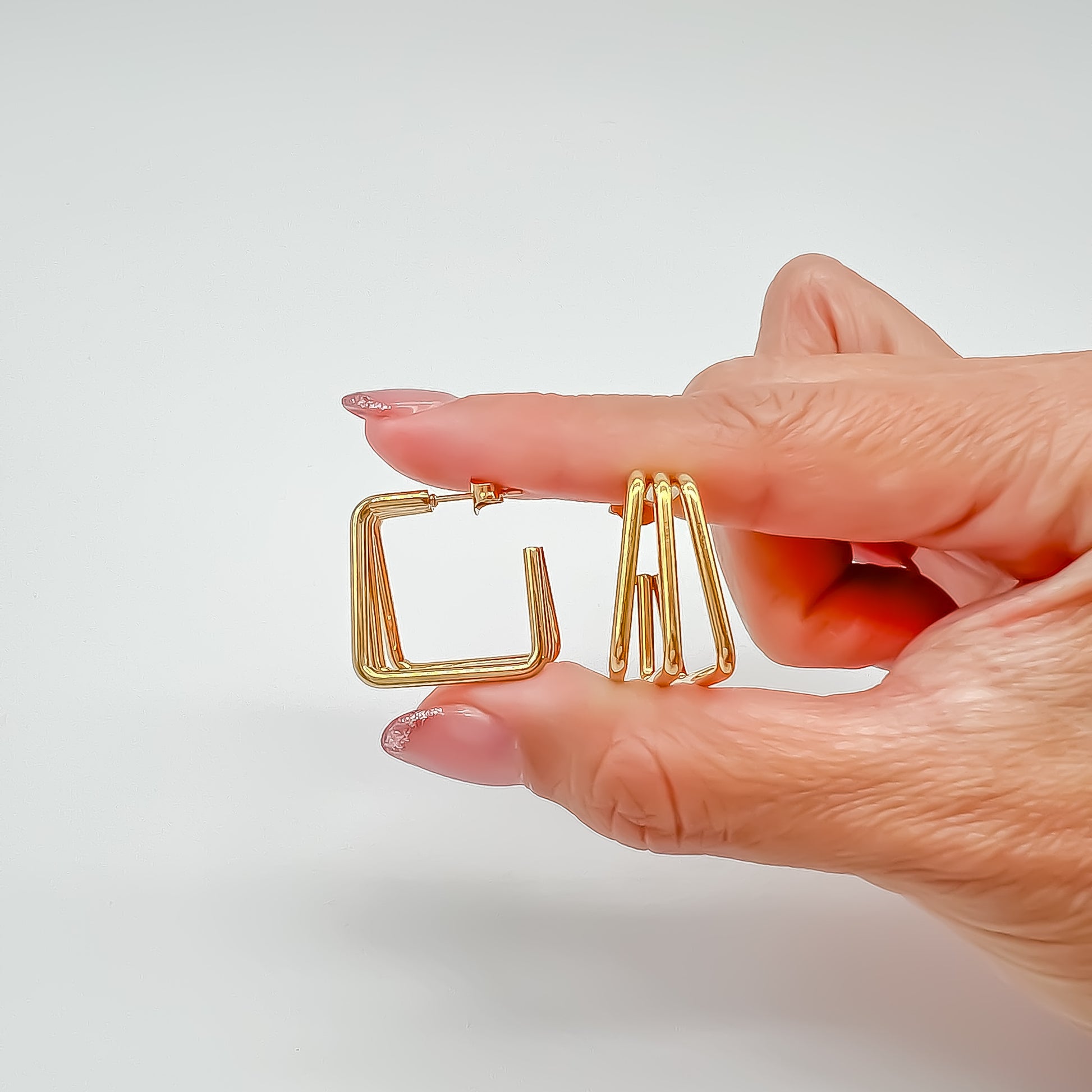 Estos aretes Arete triple cuadra dorada son perfectos para la mujer sofisticada y elegante. Hechos con acero inoxidable de alta calidad, su diseño singular y mirada elegante los hace destacar en cualquier ocasión. ¡Lúcelos con confianza y estilo!