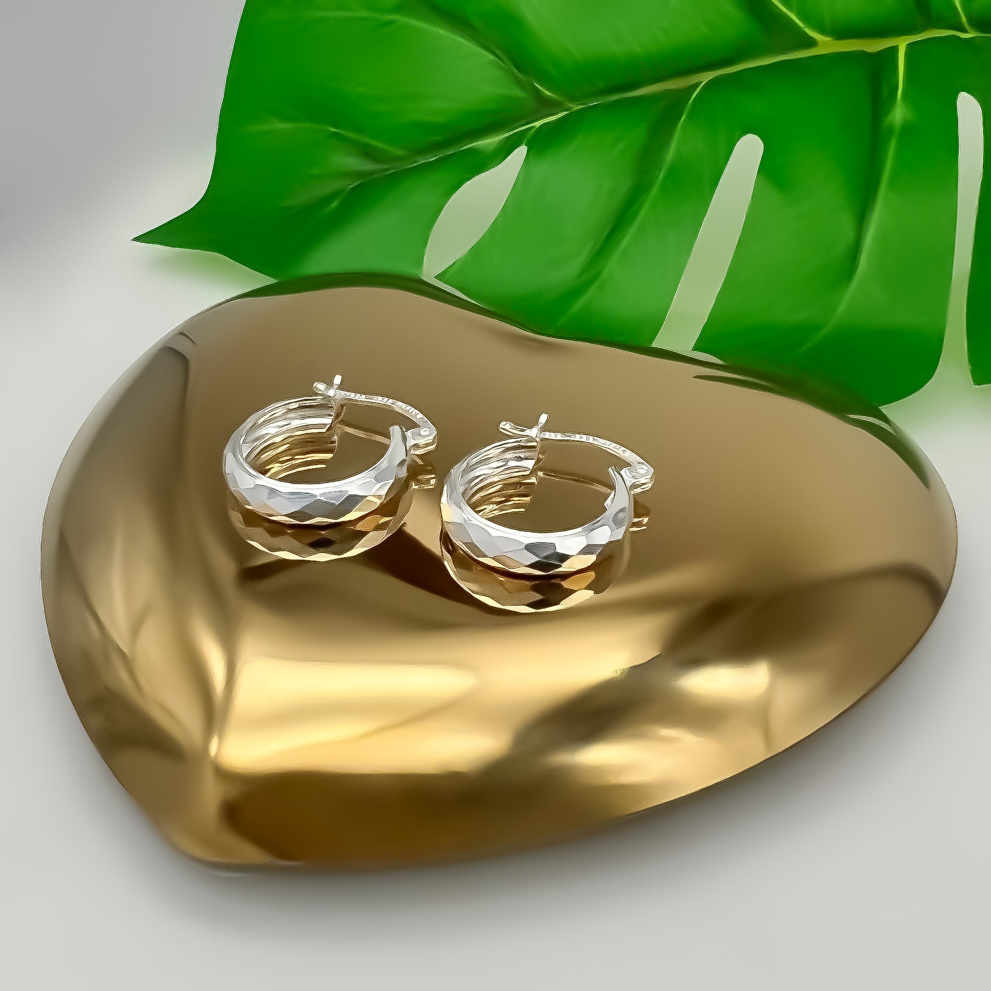 Arracadas de plata facetada con medidas de 1.8 cm x 1.8 cm diámetro, elaborado en plata. Diseñado para quienes valoran los detalles y la originalidad.