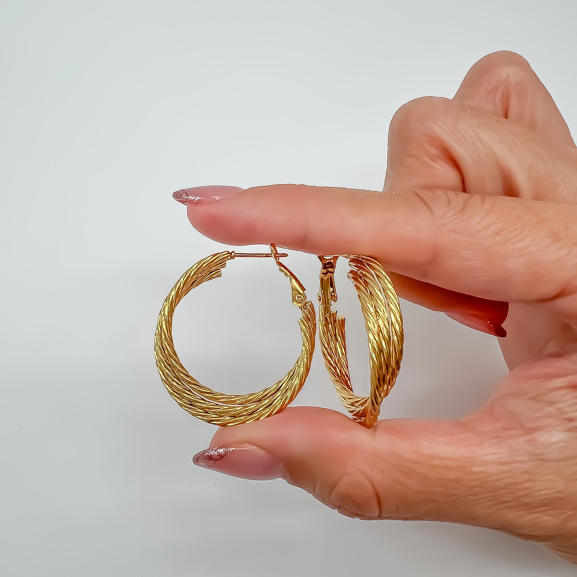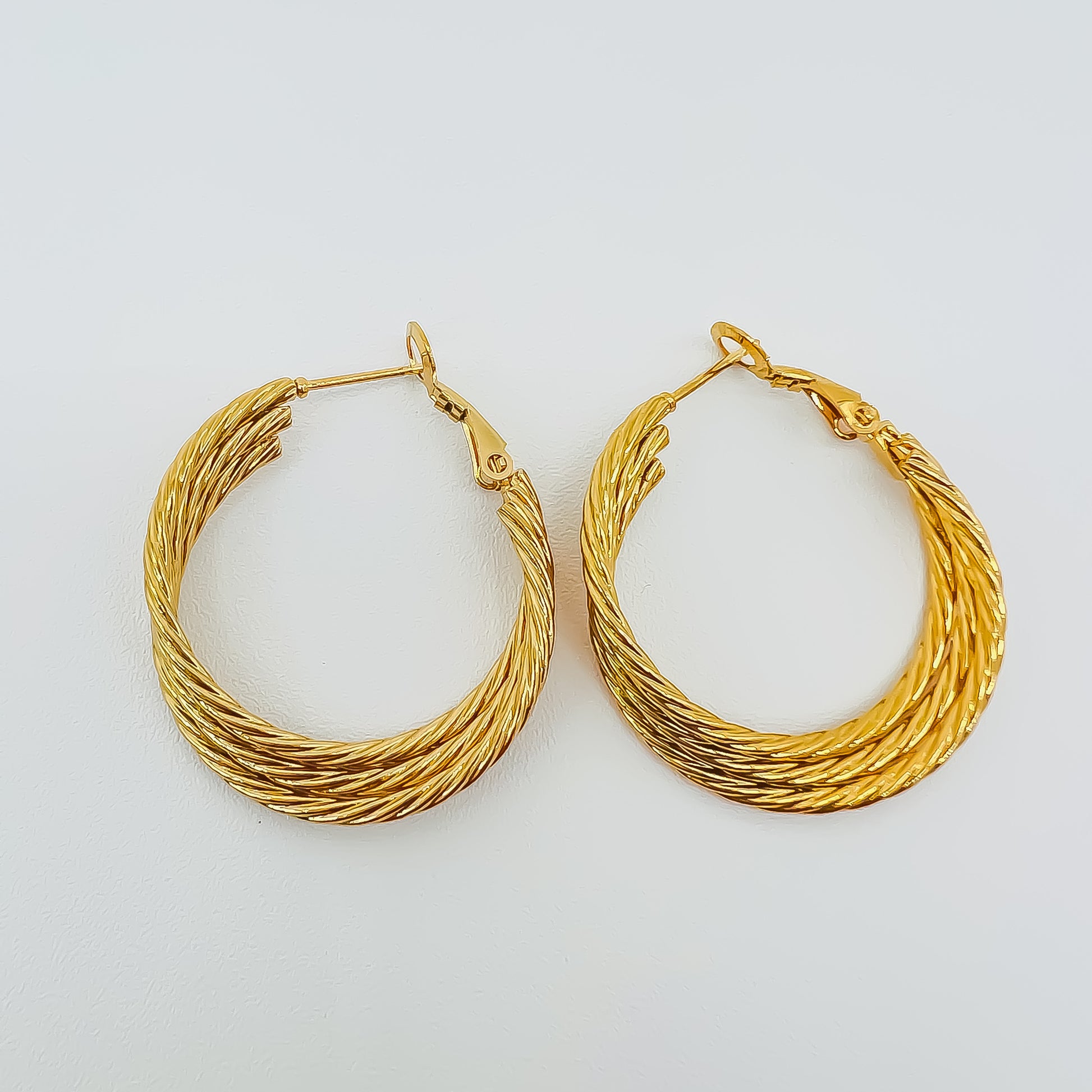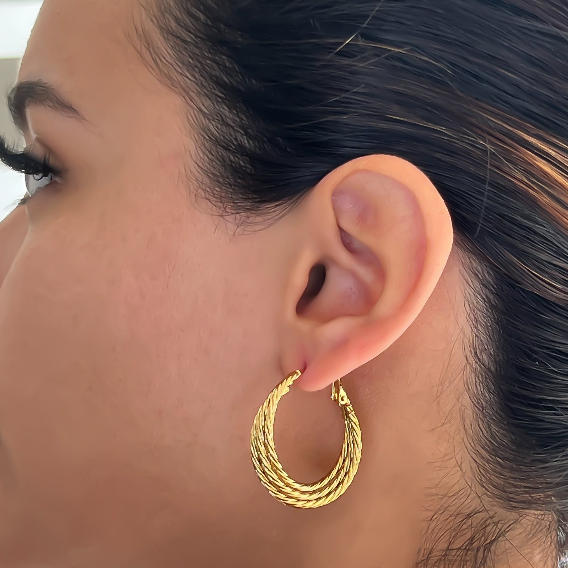 La arracada triplese destaca por su elegancia y distinción. Fabricada en acero inoxidable de alta calidad, su color dorado le otorga un aspecto visible y sofisticado. Una opción imprescindible para complementar cualquier atuendo con estilo.