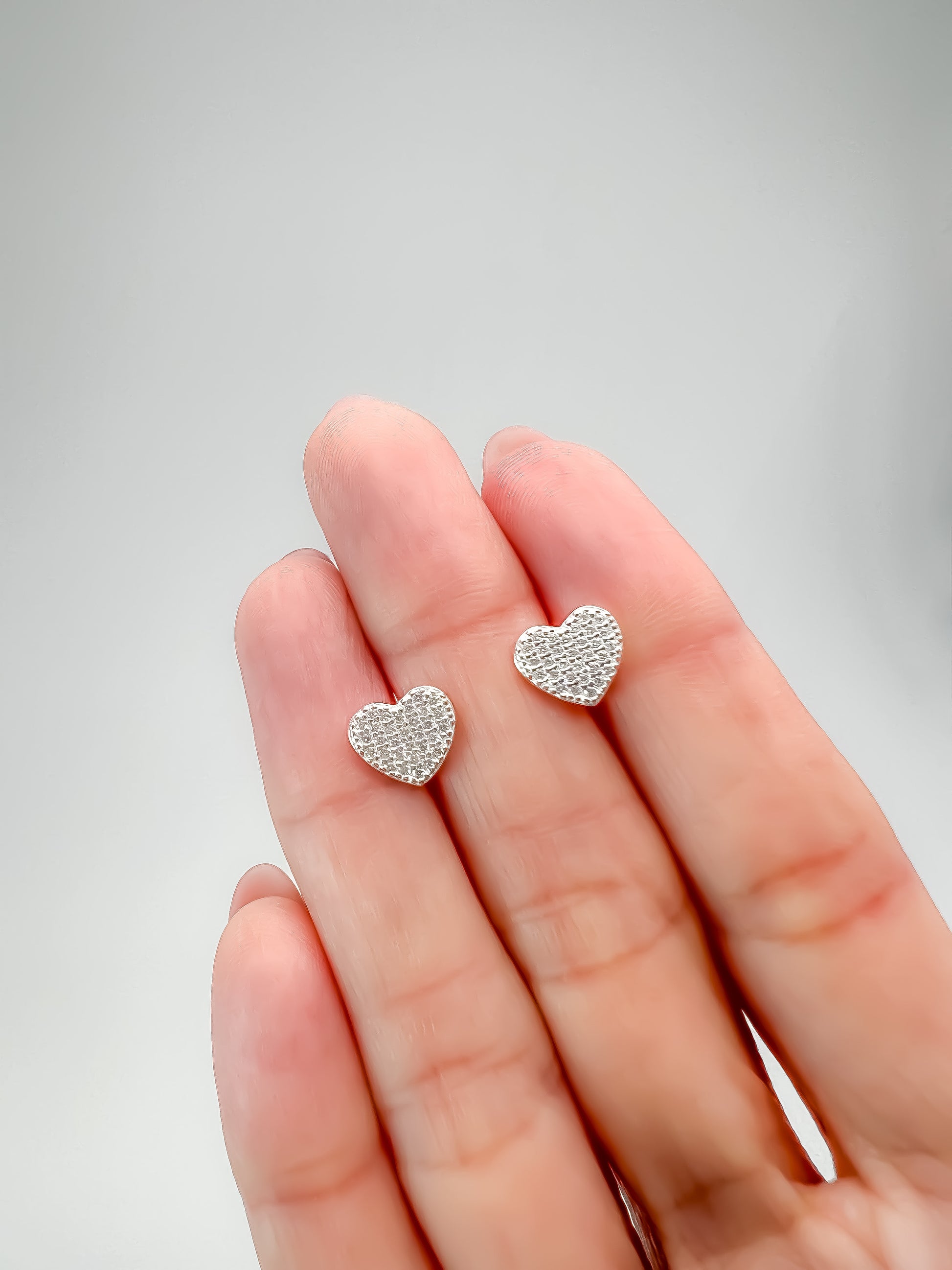 Aretes corazoncitos micro zirconias con medidas de 8mm x 9mm, elaborado en plata con micro incrustaciones. Pensado para quienes aprecian la exclusividad y el buen gusto.