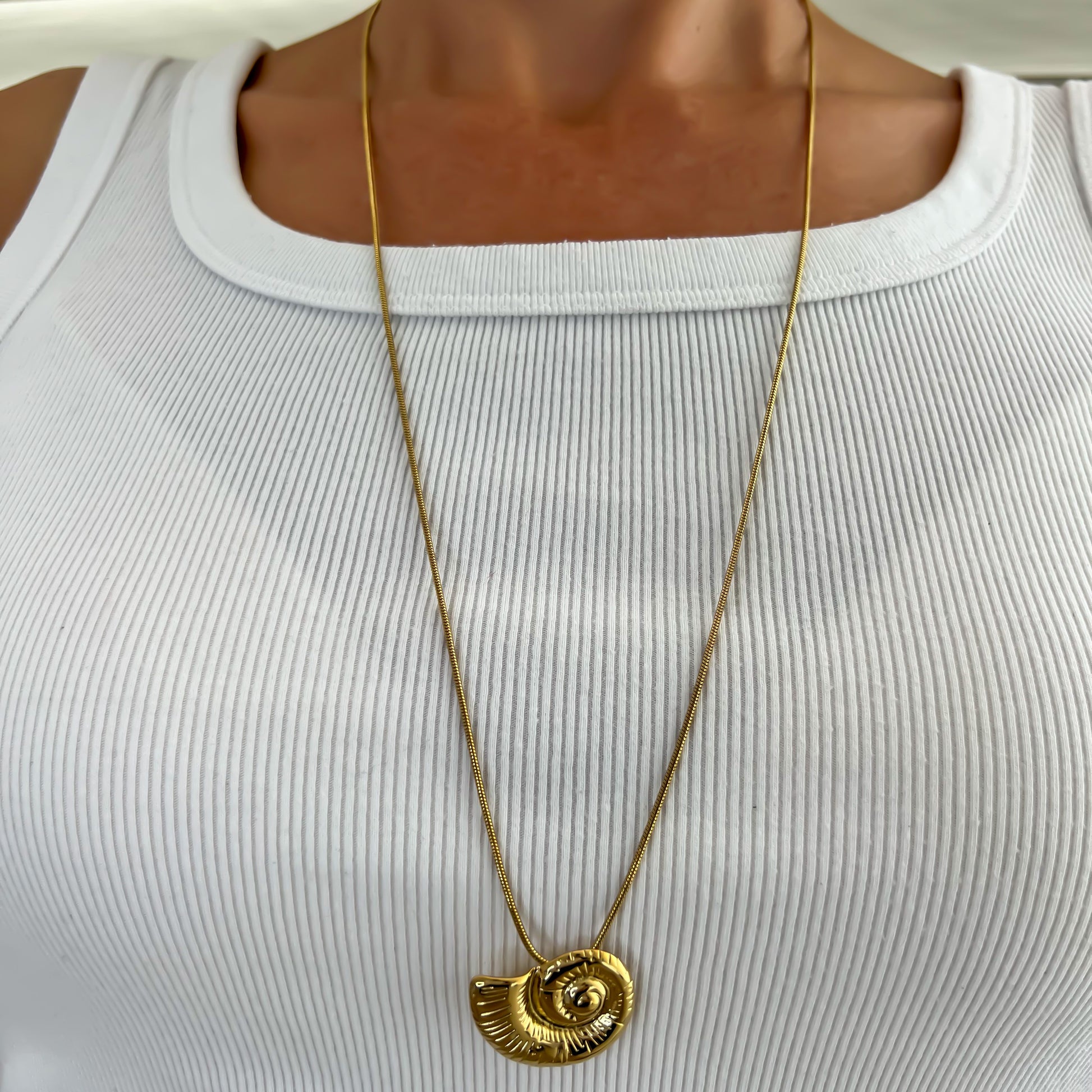 Con el Collar de caracol, tendrás un estilo playero único. Mide 70 cm de largo y cuenta con una cadena de serpiente y un dije de un hermoso caracol dorado hecho de acero inoxidable. Disfruta de un outfit especial con este accesorio que te durará por mucho tiempo. ¡Hazte con él ahora!