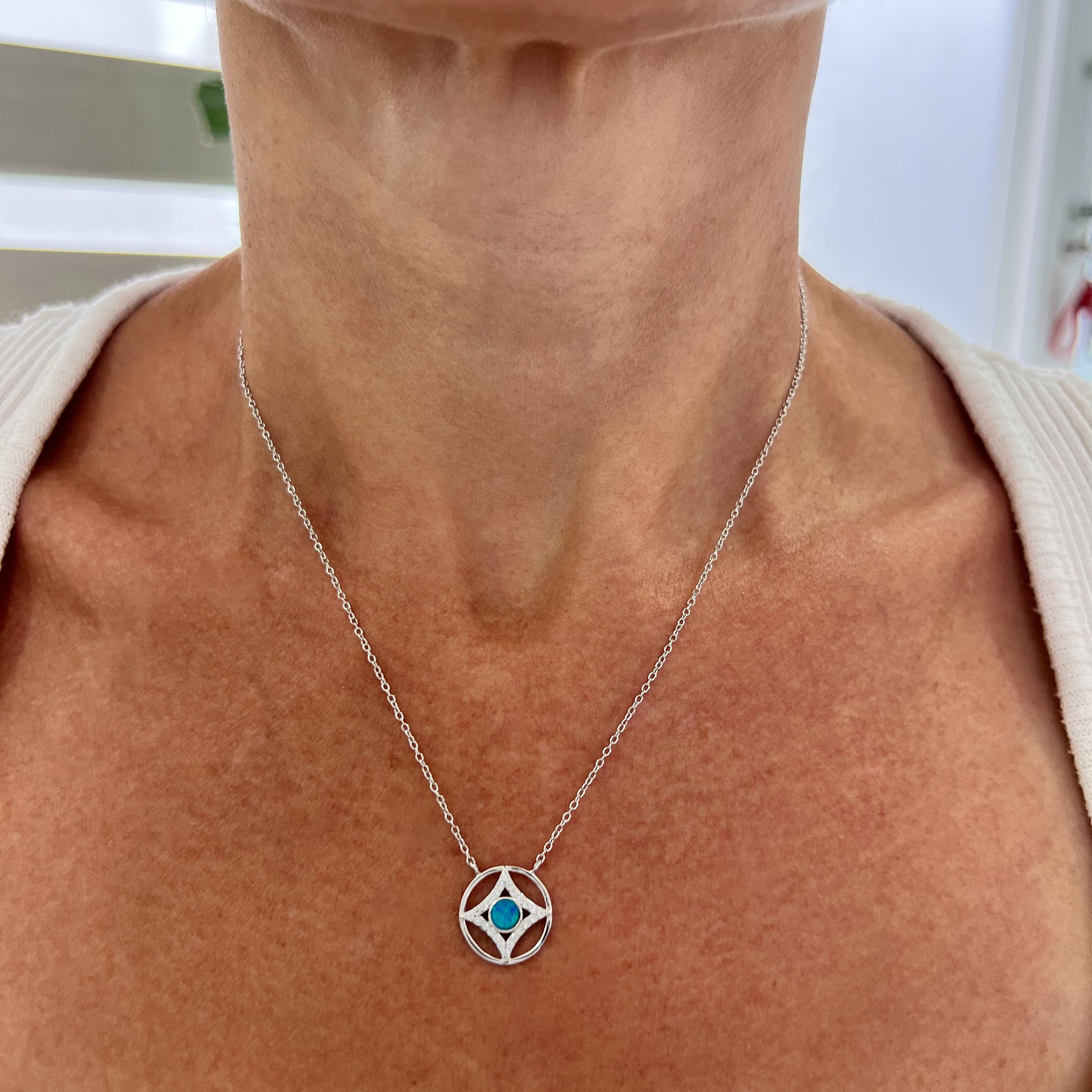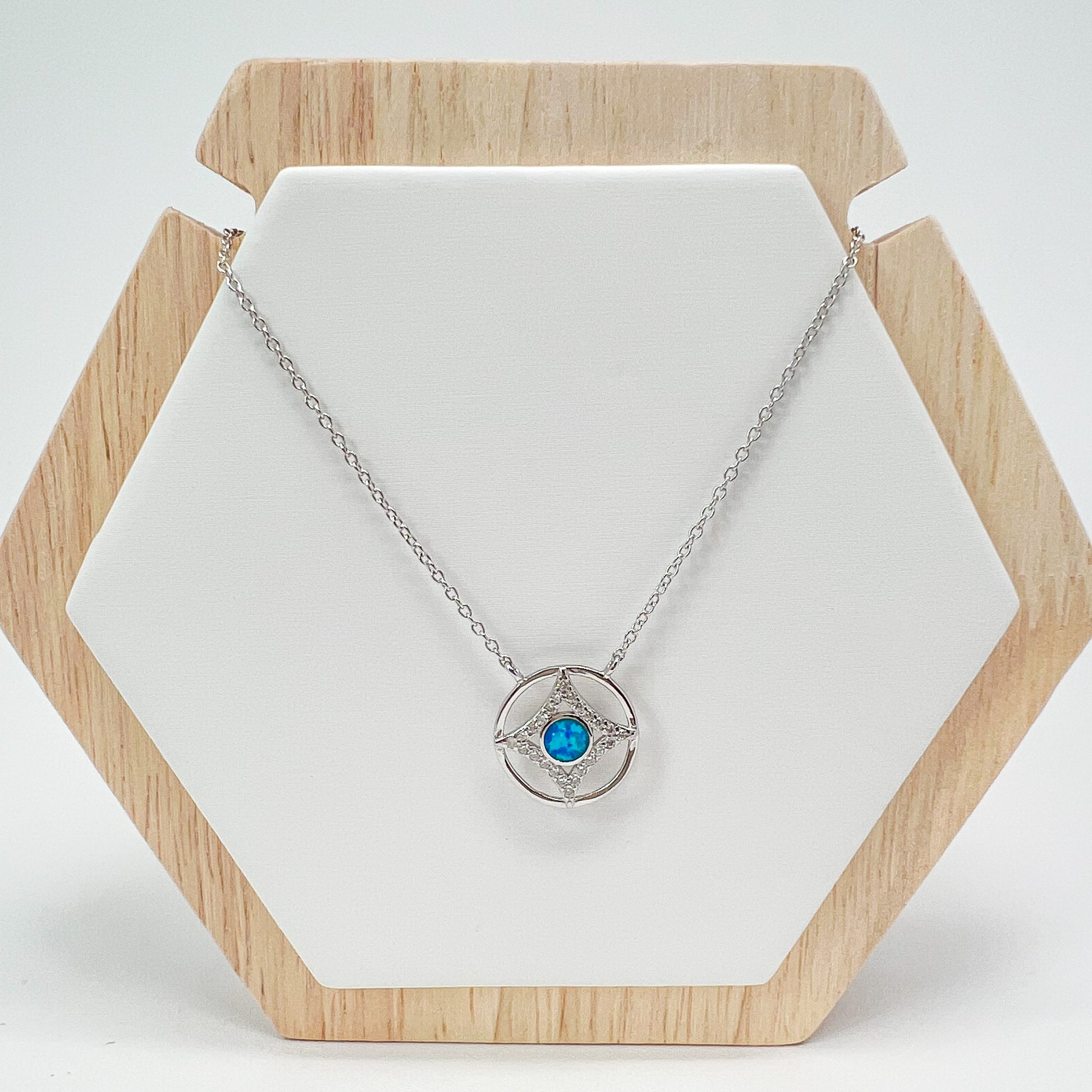 Este hermoso collar es una rosa de los vientos finamente adornada con ópalo Mexicano, el cual agrega elegancia y distinción a este bello accesorio, dale frescura y rumbo a tu estilo con este hermoso accesorio de plata. cuenta con baño de rodio para mayor protección y durabilidad. Largo 48 cm