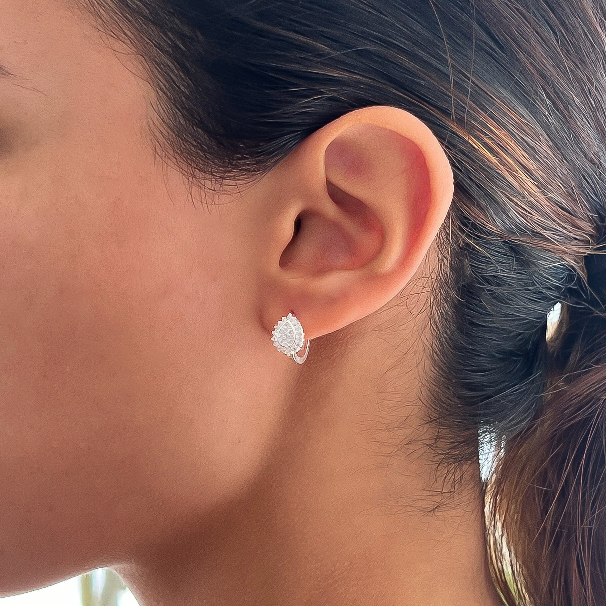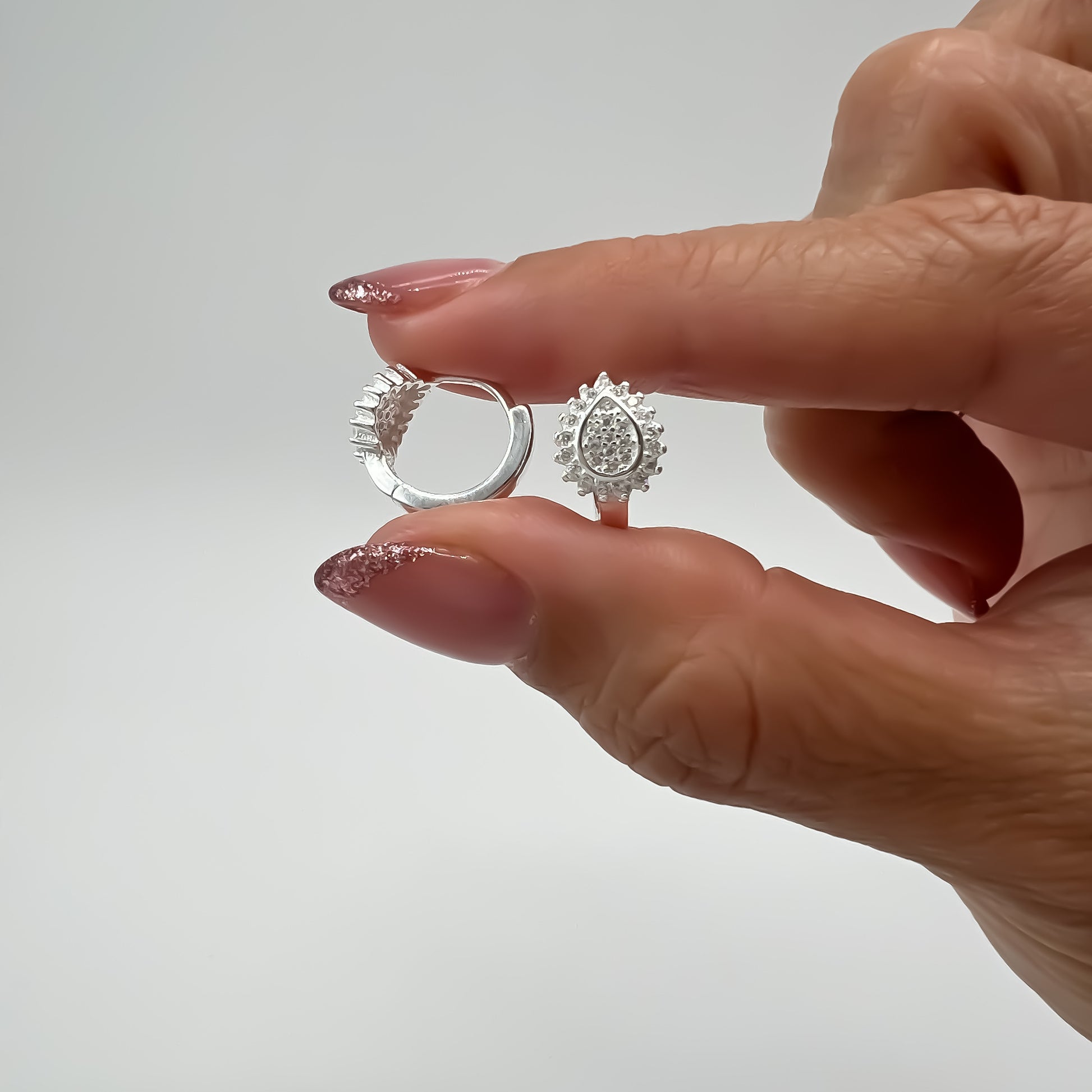 Huggies gotita con Zirconias con medidas de 1.2 cm de diámetro x 1.2 cm de diámetro, elaborado en plata con micro incrustaciones. Con un diseño que captura miradas y añade un toque especial a tu look.