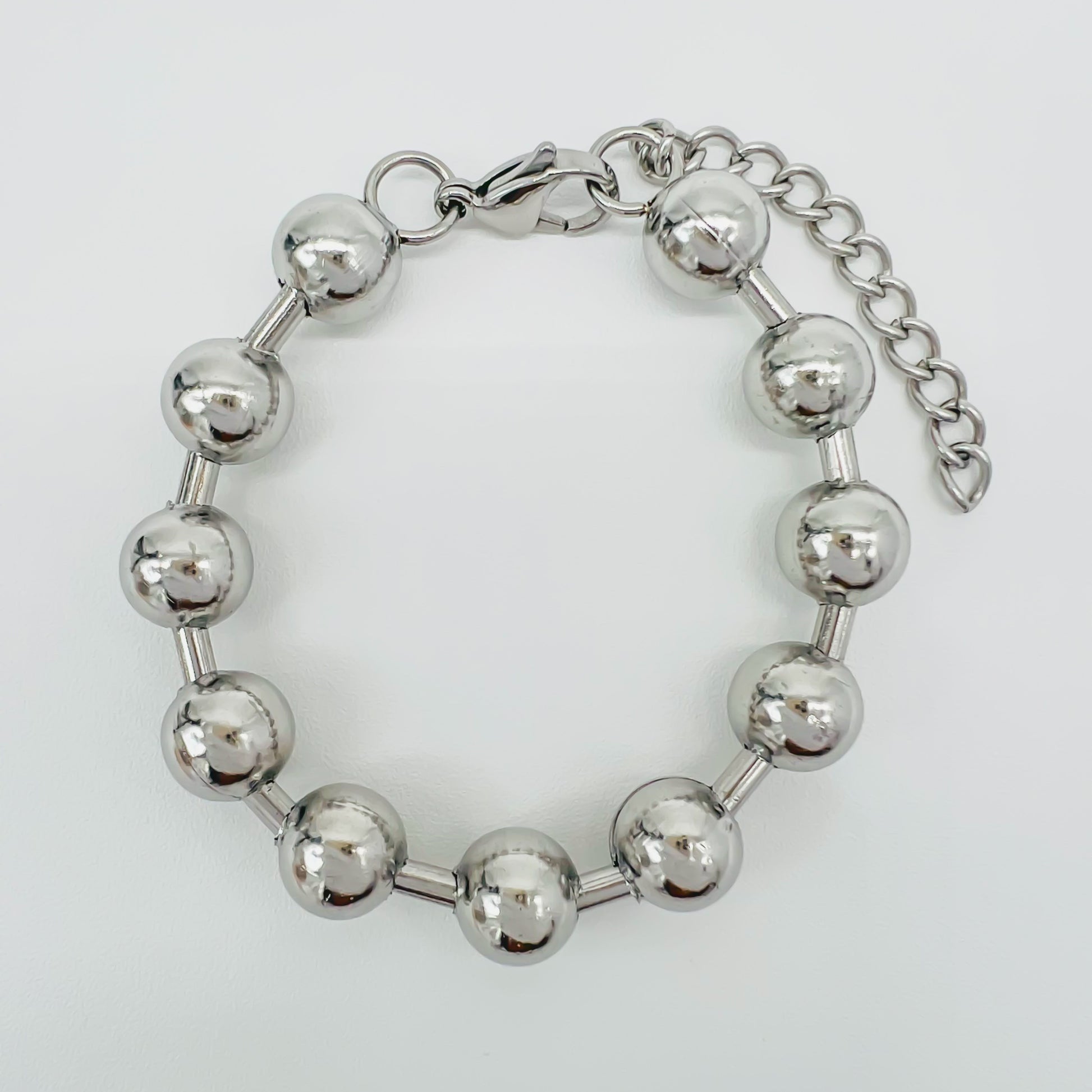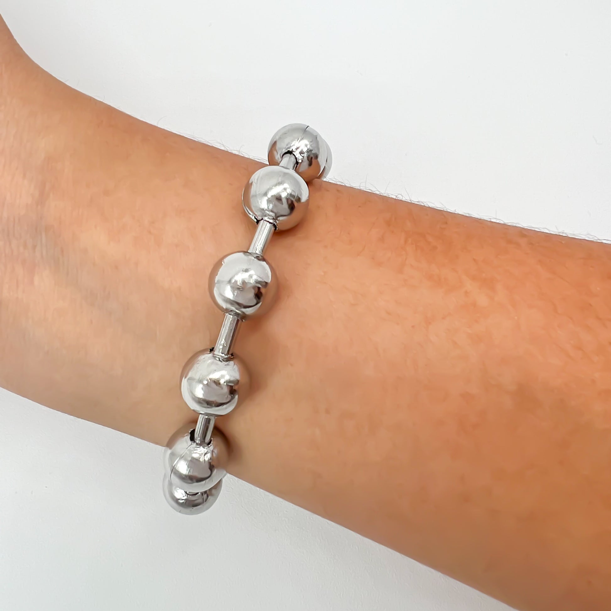 Bracelet de acero con cuentas de 10 mm y una longitud de 23 cm, que se puede ajustar hasta 5 cm. Este hermoso accesorio sofisticado siempre lucirá bien en cualquier ocasión. ¡Agrega un toque elegante a tu atuendo con esta pulsera de cuentas grandes!