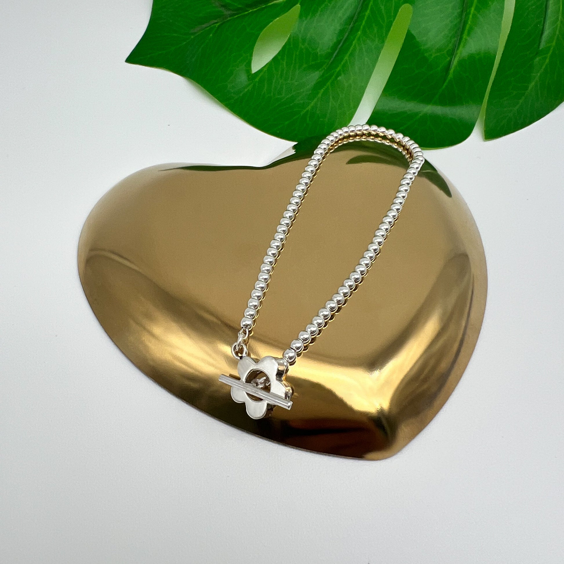 Pulsera de plata cuentas con florecita con un largo de 18.5cm, elaborado en plata. El regalo perfecto para esa persona especial en tu vida.