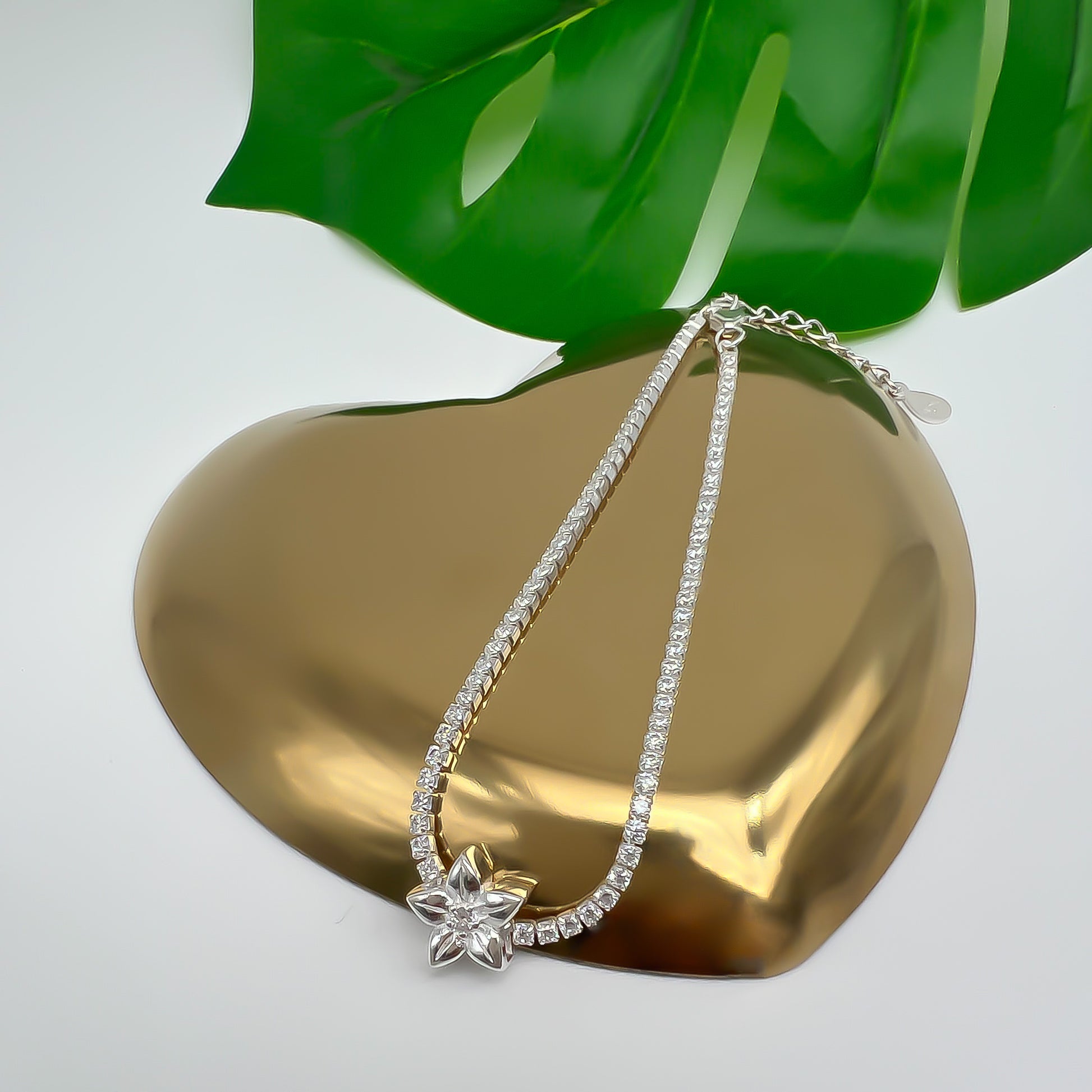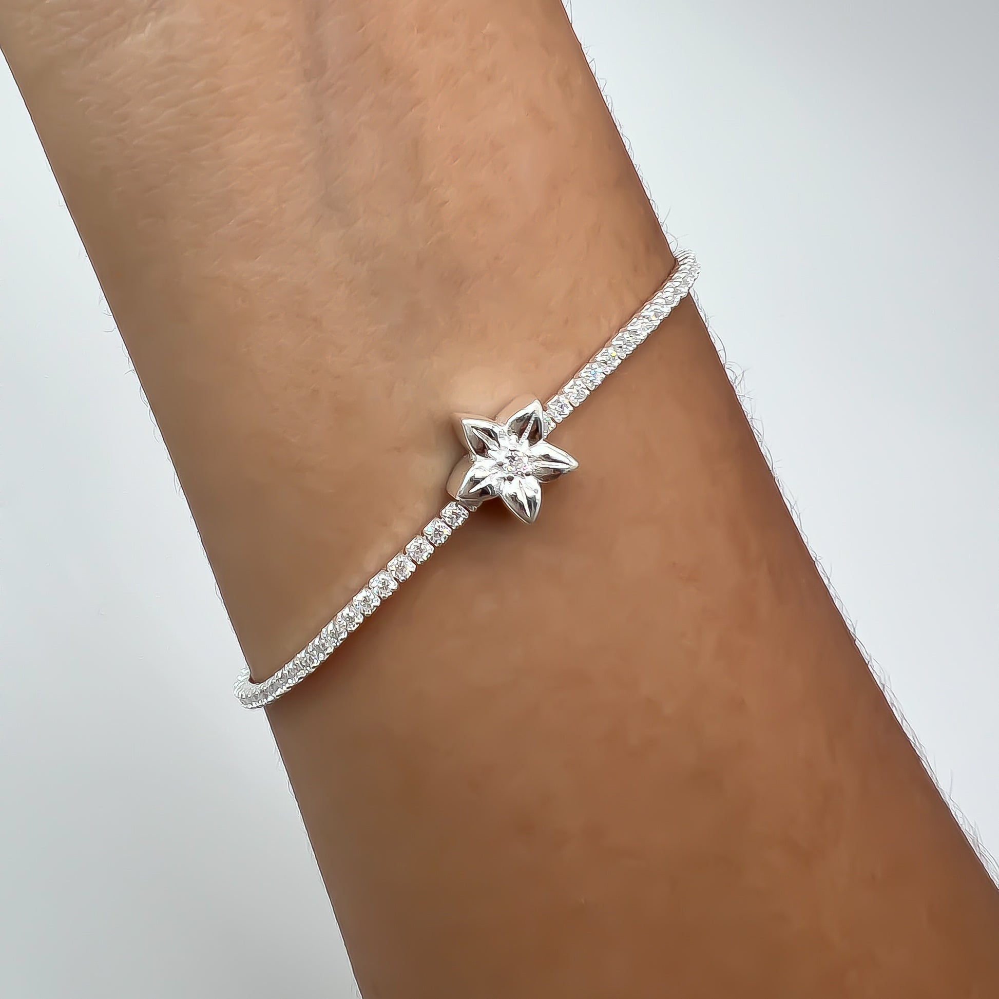 Pulsera Tennis charm flor de zirconias con un largo de 21cm, elaborado en plata y Zirconia finamente colocada. Diseñado para quienes valoran los detalles y la originalidad.
